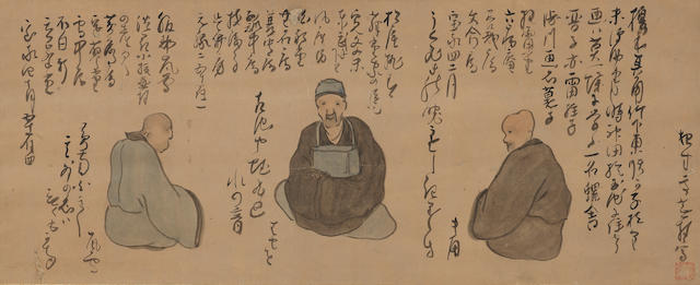 * Artwork: After Yosa Buson, 19th century. Kakejiku, in ink and slight colour on paper, depicting three tiny portraits of the three haiku poets Enomoto Kikaku, Matsuo Tosei (Basho) and Hattori Ransetsu, seated in conversation, with introductory inscriptions of the poets above and their own poems to their left, inscribed Yahantei Buson sha with seal.