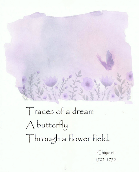 Haiku (129) – Fukuda Chiyo-ni [福田 千代尼, Phúc Điền Thiên Đại Ni) Tháng Ba 14, 2021 Pháp Hoan Fukuda Chiyo-ni [福田 千代尼, Phúc Điền Thiên Đại Ni) 1 phản hồi Haiku (129) Fukuda Chiyo-ni [福田 千代尼) Dấu mộng nhạt nhoà một cánh bướm nhỏ qua miền cỏ hoa. ________ * Pháp Hoan dịch từ bản dịch tiếng Anh. Nguyên tác thơ của Fukuda Chiyo-ni [福田 千代尼, Phúc Điền Thiên Đại Ni; 1703–1775]. Chia sẻ: Nhấp để chia sẻ trên X (Mở trong cửa sổ mới) X Nhấn vào chia sẻ trên Facebook (Mở trong cửa sổ mới) Facebook Thích Đang tải...