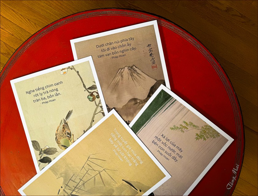 Đây là ấn phẩm gồm 100 bài Haiku của Pháp Hoan, trích ra từ hơn 700 bài Haku trong tác phẩm Tám Vạn Bốn Nghìn Cây, do Pháp Hoan sáng tác trong thời kỳ cách ly. Bộ này được Pháp Hoan trực tiếp ký tặng, đóng mộc đá và ký tên sau mỗi bức, in 3 size khác nhau: 10x15cm, 13×20cm, và 30×45cm. Các bạn muốn thỉnh trọn bộ 100 bức sẽ được tặng 20 bức từ các bộ còn lại, file PDF chất lượng cao, và được chọn album hoặc hộp gỗ kèm theo, bao gồm phí vận chuyển.