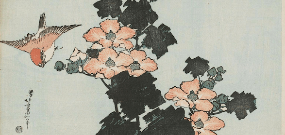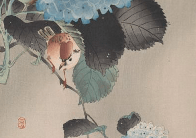 Haiku (49) Nắng rọi thung sâu vườn nhà ai rực sáng những đóa cẩm tú cầu. Artwork: Koson Japanese Woodblock