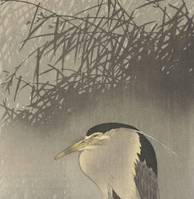 Haiku (81) Nhịn đói ba hôm xa xa tiếng hạc nghe dường trong hơn. Artwork: Flying egrets in rain by Ohara