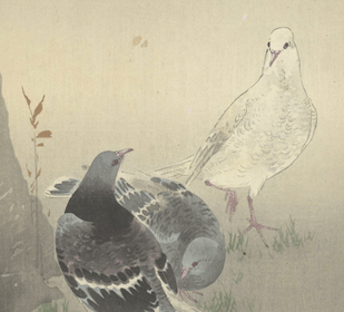 Haiku (61) Hoa đào ngày xuân rụng trên đống phân người làm rẫy. Artwork: Three Pigeons and Falling Cherry Blossoms, Ohara